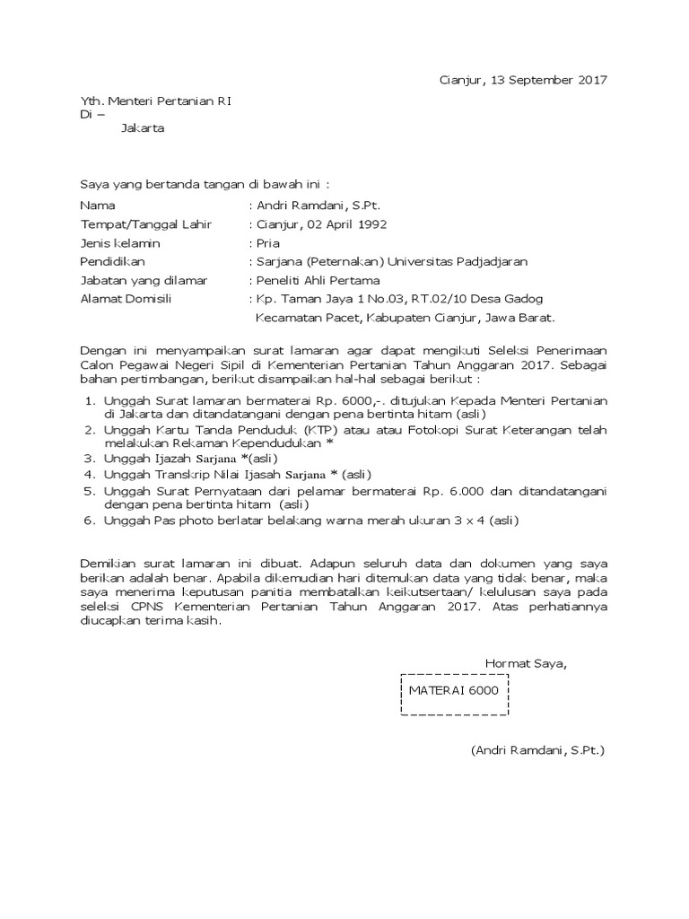 Contoh surat lamaran cpns kementerian pertanian tahun 2017. About press copyright contact us creators advertise developers terms privacy policy & safety how youtube works test new features Begini contoh surat lamaran cpns pemprov sulbar. Contoh surat lamaran dan surat pernyataan untuk pendaftaran cpns kemenag 2019, download di sini. Surat lamaran merupakan salah satu dokumen wajib yang harus disiapkan oleh para pelamar seleksi calon pegawai negeri sipil (cpns) 2021.